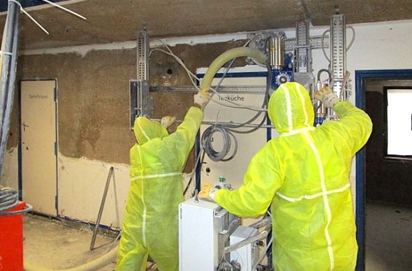 Das Wasserhöchstdruckverfahren kann innerhalb von Gebäuden zur vollständigen Entfernung von schadstoffhaltigen Putz- und Spachtelmassen sowie Farbbeschichtungen eingesetzt werden.